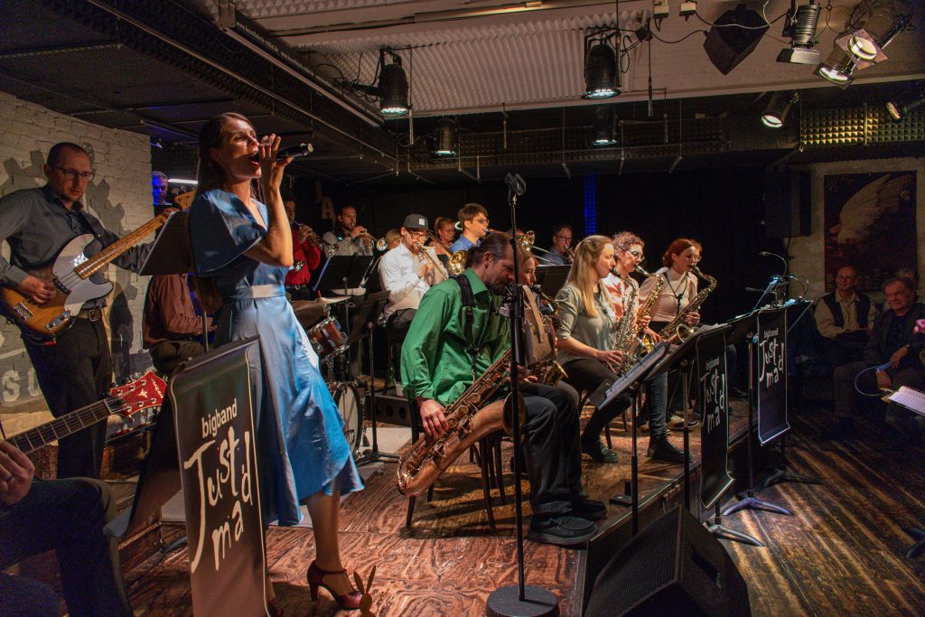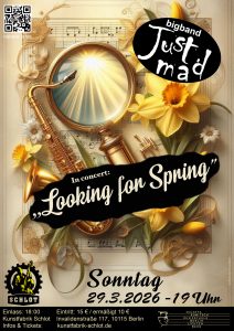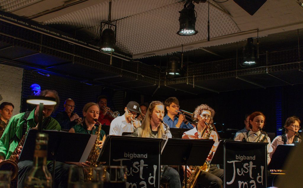Die Big Band Just Mad in Topform und gemeinsam mit ihrem engagierten, herzlichen Publikum auf der Suche nach dem Frühling im knackevollen Jazzclub Schlot – da muss man dabei gewesen sein!